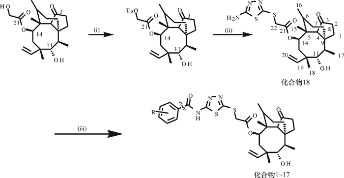1.2 截短侧耳素衍生物的合成18 种截短侧耳素衍生物的合成在Shang等[13]、王波等[14]合成方法基础上略作改进,具体步骤为以对甲苯磺酰氯活化截短侧耳C14支链上的羟基得对甲苯磺酰化截短侧耳素,碱性条件下与2-氨基-S5-巯基-1, 3, 4-噻二唑反应在截短侧耳素C14支链引入噻二唑环,得到化合物18,最后再与苯环上有不同取代基的苯甲酰氯进行酰基化反应,得到化合物(1~17)(图 1)。所有产物经柱色谱分离得到高纯度的18种含有不同取代基的截短侧耳素衍生物,18种化合物经高分辨质谱进行结构确证。