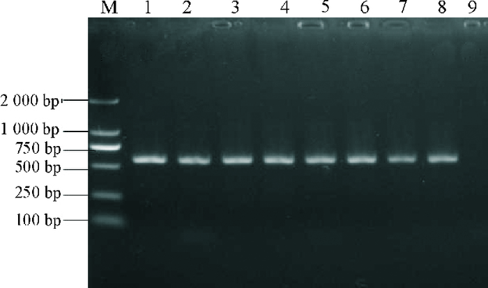 图 1 香蕉枯萎病菌4个生理小种的ITS-PCR扩增产物 Figure 1 ITS-PCR products of four physiological races of Fusarium oxysporum f. sp. cubense M:DL2000 DNA Marker;1:WG02;2:WG03;3:WG04;4:WG05;5:Z13;6:Z14;7:Z15;8:Z16;9:ddH2O。 |