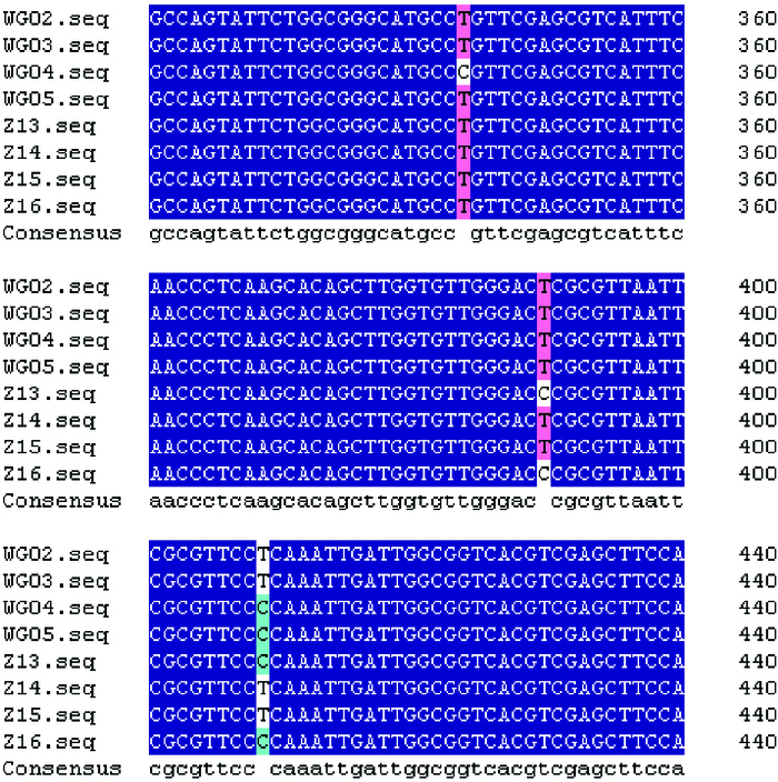 图 2 香蕉枯萎病菌4个生理小种的ITS序列比对 Figure 2 ITS sequences alignment of four physiological races of Fusarium oxysporum f. sp. cubense WG02、WG03、WG04、WG05分别为国外的1~4号生理小种菌株;Z13和Z16为国内的4号生理小种菌株;Z14和Z15为国内的1号生理小种菌株。 |