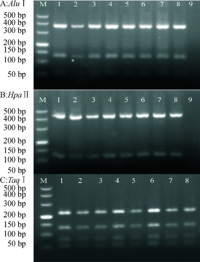 限制性内切酶Alu Ⅰ、Hpa Ⅱ和Taq Ⅰ购于宝生物工程(大连)有限公司。