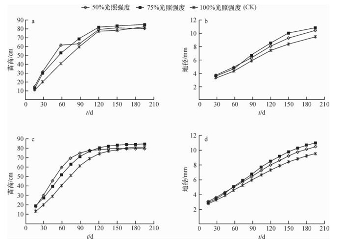 1.3.2 指标测定幼苗移栽后置于同一条件下培养10 d,选取长势一致的苗木于不同光照强度下处理15 d(移栽后第25天)开始测定,按照系统抽样标记待测植株,每小区选取代表性植株20株,每月测量记录每样株的苗高与地径(前2次每隔13~15 d测苗高,地径于移栽后28 d开始测量)直至11月25日结束(移栽后197 d),苗高和地径分别采用钢卷尺和游标卡尺测定(精确度0.10 cm和0.01 mm)。