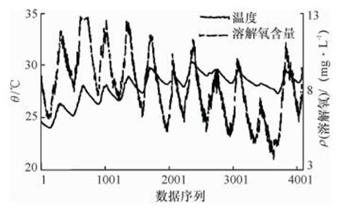 图 9 鱼塘中溶解氧含量和温度变化 Figure 9 Changes of average daily dissolved oxygen content and temperature in fishpond |