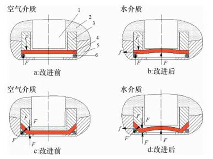 1.2.3 全自动增氧机溶解氧传感器的改进密封是溶解氧传感器长期、安全、稳定运行的保证,其透气膜在不同介质中的受力情况不同。介质为空气时,改进前、后结构剖面分别如图 2a、2c所示,与改进前相比,改进后透氧膜受到透氧膜膜盖对透氧膜的压力和O形密封圈对透氧膜的支持力,以及三角沟槽斜面对透氧膜的压力和垫圈的支持力,纵向和横向受力均平衡;介质为水时,改进前、后结构剖面分别如图 2b、2d所示,受水压的作用透氧膜向内凸起变形,横向摩擦力分为2部分:平面上的透氧膜膜盖、外壳体和透氧膜之间的摩擦力;三角沟槽的斜面上透氧膜膜盖、O形密封圈和透氧膜之间的摩擦力。横向的摩擦力增大,密封性增强。其中O形密封圈以及密封槽的尺寸是保证密封的关键之处。改进后的O形密封圈被安装在三角沟槽和透氧膜膜盖密封面之间,由两者压缩产生的弹性压力实现密封。