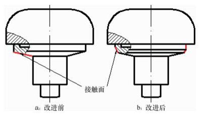 图 3为上盖改进前、后的结构图,由于轴头的倒角属于辅助工序,改进前被忽视,导致上、下盖安装产生干涉现象,甚至会导致阴电极和透氧膜之间的距离增大,影响测量;改进后使该倒角与下盖倒角相配合,方便溶解氧传感器上、下盖的安装。