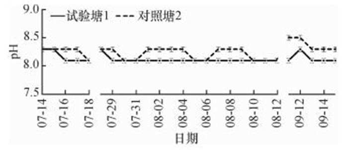 图 5所示为试验塘1和对照塘2在养殖期间测试的pH均值变化趋势。从图 5可以看出,养殖期间,试验塘1的pH保持为8.0~8.4,较为稳定;对照塘2的pH为8.0~8.6,相对试验塘1的pH波动较为剧烈,且一直高于试验塘1。pH异常易使水产品正常生理活动受到影响,生长速度缓慢甚至死亡。一般鳜鱼养殖鱼塘pH控制为6.5~8.5[14-15],全自动增氧机控制养殖模式可以为鳜鱼养殖提供一个合适的pH环境。