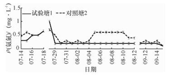图 6所示为试验塘1和对照塘2氨氮含量变化曲线。从图 6中可知,养殖期间,试验塘1氨氮含量低于对照塘2,试验塘1氨氮含量养殖初期处于下降趋势,随后保持稳定,而对照塘2氨氮含量先上升后下降,波动较大。在高密度养殖水体中,由于废料使用不当、水产动物排泄物的积累等易造成养殖水体中氨氮含量过高,从而引起水体缺氧、水质恶化[16],致使水产品出现中毒、死亡等现象。相比手动控制增氧机,全自动增氧机能够较好地改善养殖水体环境,合理增氧的同时能够促进养殖水体上、下层交流,降低氨氮的含量。