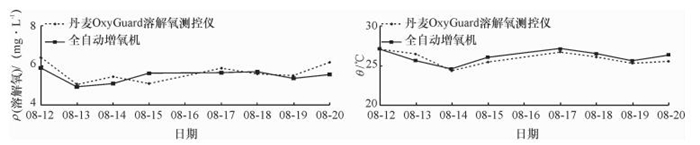 根据独立样本t检验分析得出全自动增氧机氧传感器测量的平均溶解氧含量为5.44 mg·L-1、平均温度为25.93 ℃,丹麦OxyGuard溶解氧测控仪测量的平均溶解氧含量为5.65 mg·L-1、平均温度为26.11 ℃,2组数据的方差齐性检验结果均是不显著的,2组数据的差异也不显著。图 9为全自动增氧机与丹麦OxyGuard溶解氧测控仪每日平均溶解氧含量变化以及温度变化趋势图(限于篇幅,只选用了8月12日至8月20日时间段的数据进行分析)。在长期使用中,全自动增氧机与丹麦OxyGuard溶解氧测控仪每日平均溶解氧含量变化趋势一致,所测溶解氧含量相差±0.6 mg·L-1;全自动增氧机与丹麦OxyGuard溶解氧测控仪的每日平均温度变化差异不大,所测温度相差±0.8 ℃。因此,在长时间使用过程中,全自动增氧机测量的溶解氧含量、温度较准确。