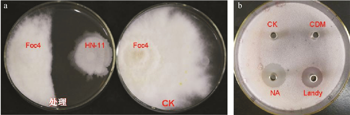 图 1 解淀粉芽孢杆菌HN-11对香蕉枯萎病菌的抑制效果 Figure 1 Inhibition effect of Bacillus amyloliquefaciens HN-11 against banana fusarium wilt pathogen a:平板对峙试验;b:牛津杯法试验。 |