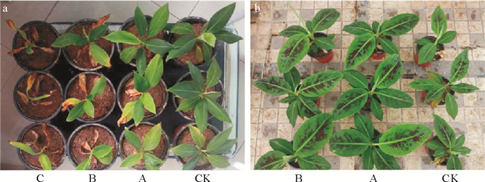 图 2 印楝渣生物药肥对香蕉生长的影响 Figure 2 Effect of neem bioorganic fertilizer on banana growth a:施用未经发酵腐熟的印楝渣处理;b:施用发酵腐熟的印楝渣生物药肥; CK:不添加生物药肥,A、B、C分别为添加生物药肥(w)5%、10%和15%。 |