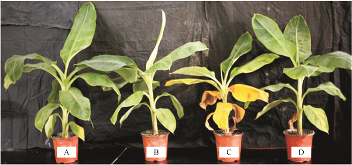 图 3 印楝渣生物药肥对香蕉枯萎病的防治效果 Figure 3 Control efficiency of neem bioorganic fertilizer against banana fusarium wilt A:10%(w)生物药肥+Foc4;B:5%(w)生物药肥+Foc4;C:阳性对照(Foc4);D:空白对照。 |