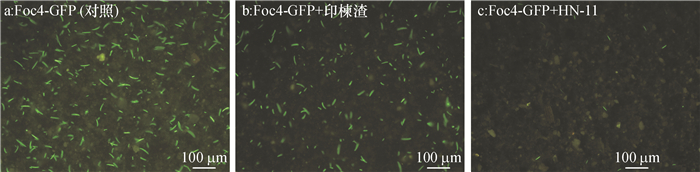1.4 抑菌机理研究 1.4.1 土壤培养法测定抑菌效果试验设置3个处理:添加印楝渣(6.0 g),接种香蕉枯萎病菌Foc4-GFP(5 mL);添加生防菌株HN-11(5 mL),接种香蕉枯萎病菌Foc4-GFP(5 mL);对照只接种香蕉枯萎病菌Foc4-GFP(5 mL),不添加印楝渣和生防菌株HN-11。