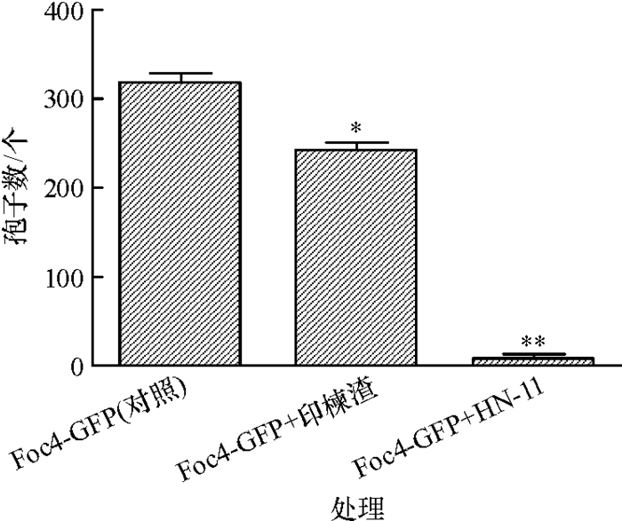 图 5 印楝渣和生防菌株HN-11处理后的香蕉枯萎病菌孢子数 Figure 5 Number of Fusarium oxysporum Foc4 spores after treating by neem cake and biocontrol strain HN-11 *、**分别表示处理与对照在0.05、0.01水平差异显著(Duncan’s法)。 |