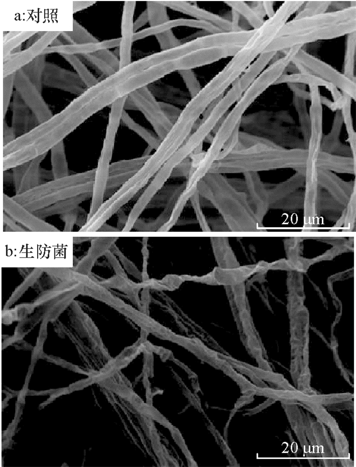 进一步通过扫描电镜观察生防菌HN-11处理前后香蕉枯萎病菌菌丝形态结构的变化,结果见图 6。从图 6可以看出,对照组香蕉枯萎病菌菌丝表面光滑完整(图 6a),而经生防菌HN-11作用后,香蕉枯萎病菌菌丝表面粗糙,出现不规则皱褶,部分菌丝断裂、凹陷(图 6b)。