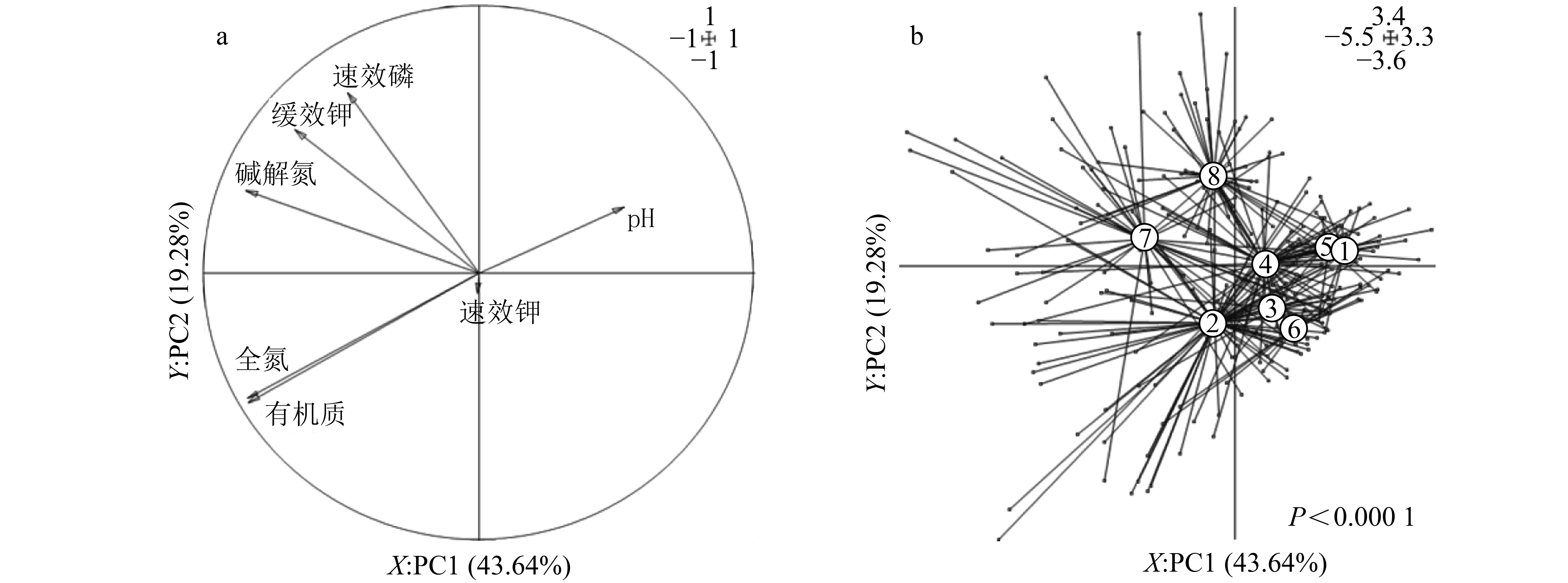 第2主成分方差贡献率为19.28%(Y轴),其与土壤有机质、全氮、速效磷、缓效钾和pH等变量紧密联系(图1a),⑧的土壤肥力特征能与②、③和⑥的土壤明显区分,前者的土壤样点明显向pH、速效磷和缓效钾含量较高以及全氮和有机质含量较低的方向偏移(P<0.000 1,图1b),而后三者则向相反的方向偏移。