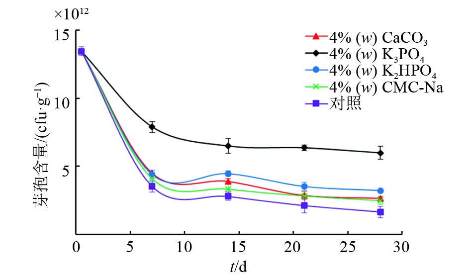从图1中可以看出,在加入不同稳定剂后,各处理芽孢含量均随着时间延长而减少,最终趋于稳定。其中,以碳酸钙,磷酸氢二钾和羧甲基纤维素钠为稳定剂的菌粉复合物芽孢含量与对照组差异不大。当磷酸钾作为稳定剂时,芽孢含量明显高于其他处理,混合处理28 d后,芽孢含量达6.0×1012 cfu·g–1,因此,在菌粉中添加质量分数为4%的磷酸钾作为稳定剂。