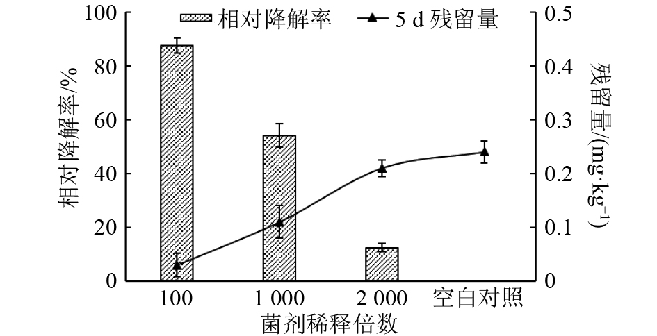 在室内模拟条件下,将36 mg·kg–1 β-CP施用土壤2 d后,喷施BSF01菌剂100、1 000和2 000倍稀释液,经HPLC分析,各处理中β-CP原始沉积量分别为5.71、6.13和8.71 mg·kg–1。5 d后取样检测,土壤中β-CP残留量分别为0.03、0.11和0.21 mg·kg–1,降解率达到99.47%、98.37%和97.70%,降解效果显著(图4)。相较于5 d后空白对照的残留量(0.24 mg·kg–1),各稀释菌剂处理间差异明显,相对降解率分别为87.50%、58.33%和16.67%,表明该菌剂对土壤中β-CP具有快速、高效的降解效果,且降解能力与菌剂的使用剂量相关,具有进一步优化应用潜力。