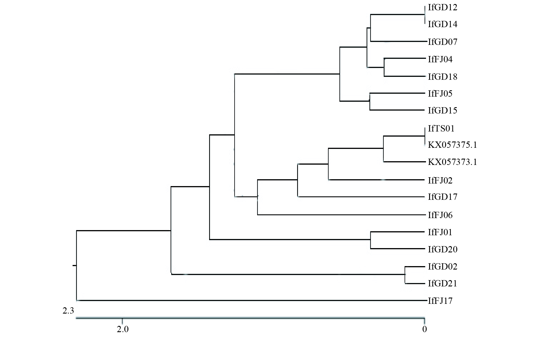 2 结果与分析 2.1 各地区玫烟色棒束孢的ITS序列相似性分析将供试玫烟色棒束孢菌株的ITS序列与参考菌株构建系统发育树(图1),结果发现除了来自福建的IfFJ17菌株与参考菌株(KX057375.1、KX057373.1) 的ITS序列相似性为97.7%外,其余15个菌株与参考菌株(KX057375.1、KX057373.1)ITS序列的相似性均高于98.0%。但是,结果显示供试菌株没有明显的地域性遗传分化倾向,比如,来自青海的IfTS01菌株与参考菌株KX057375.1的ITS序列几乎相同,也与福建菌株IfFJ02、IfFJ06及广东菌株IfGD17的ITS序列高度相似。