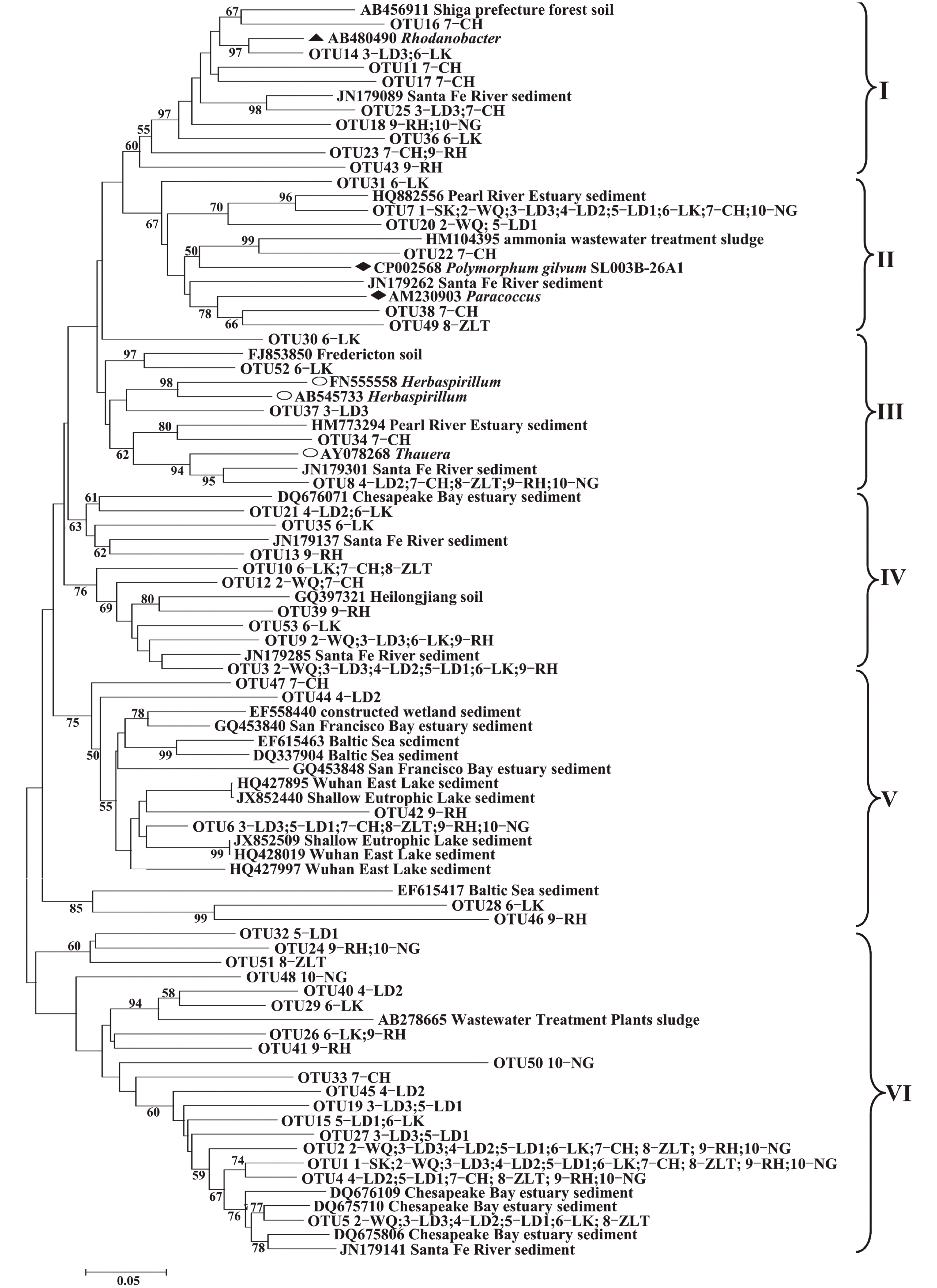 通过与NCBI数据库nirS序列比对,发现流溪河沉积物中大多数nirS序列与已知的反硝化细菌亲缘关系较远,与数据库其他环境样品中的nirS序列有较高相似性(图2)。根据邻位相接法构建系统进化树,将所有序列分成6簇,第1簇与γ–变形菌纲的产黄杆菌属Rhodanobacter有较高相似性;第2簇与α–变形菌纲的副球菌属Paracoccus以及Polymorphum gilvum的菌株SL003B–26A1有较高相似性;第3簇与β–变形菌纲的草螺菌属Herbaspirillum和陶厄氏菌属Thauera有较高相似性。其他簇序列没有亲缘关系较近的已知物种。