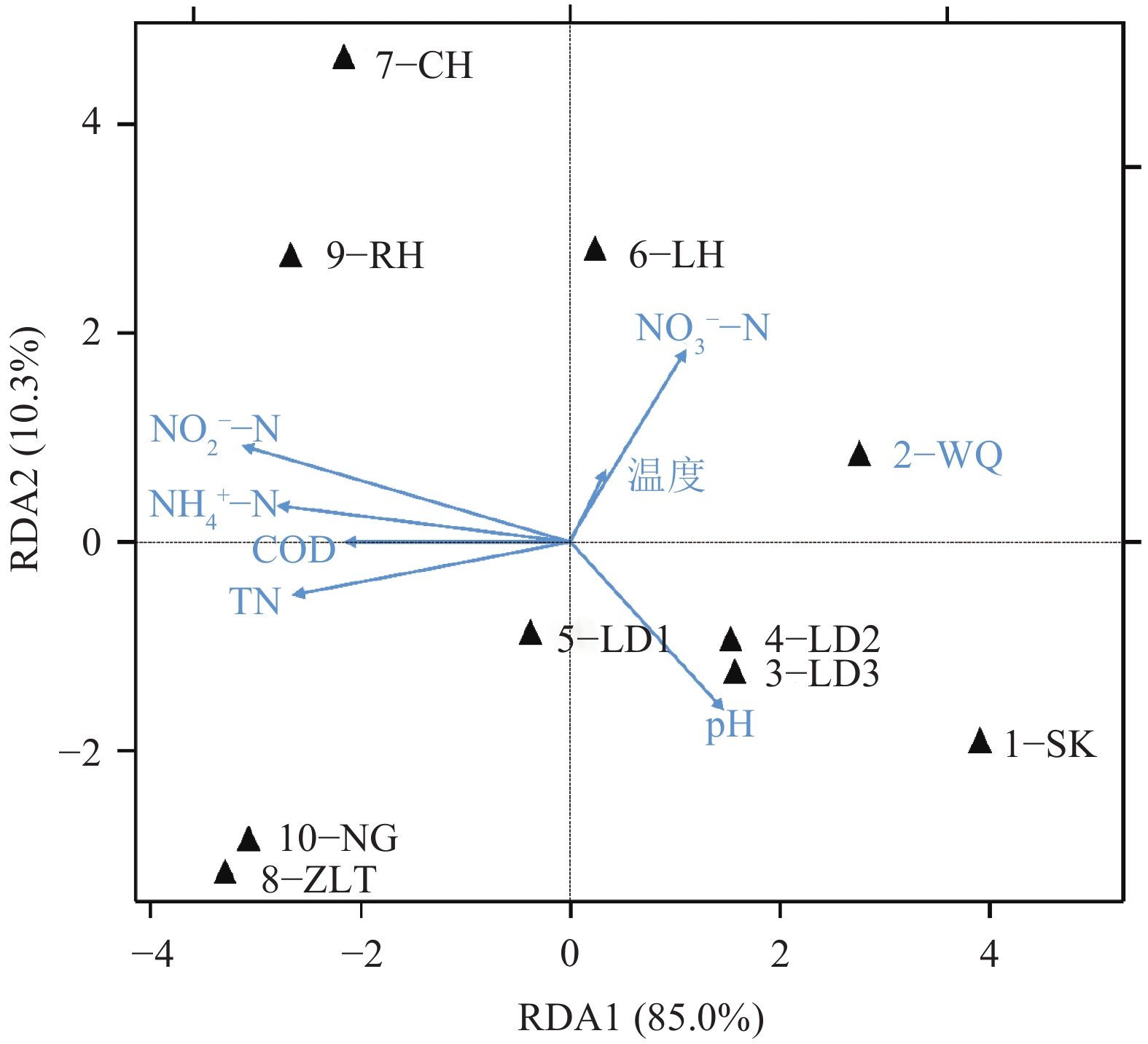 1 材料与方法 1.1 材料本试验在流溪河干流及支流上选取了10个采样点,从上游向下游依次标记为:水库(1–SK)、温泉(2–WQ)、绿道–3(3–LD3)、绿道–2(4–LD2)、绿道–1(5–LD1)、良口(6–LK)、从化(7–CH)、钟落潭(8–ZLT)、人和(9–RH)、南岗(10–NG)(图1)。使用自制的底泥采样器,在各个采样点采取水底表层(0~5 cm)的沉积物,采集后立刻放入无菌自封袋内,用干冰低温保存。每个采样点采集沉积物样品1 kg左右,返回实验室后保存于–80℃超低温冰箱。