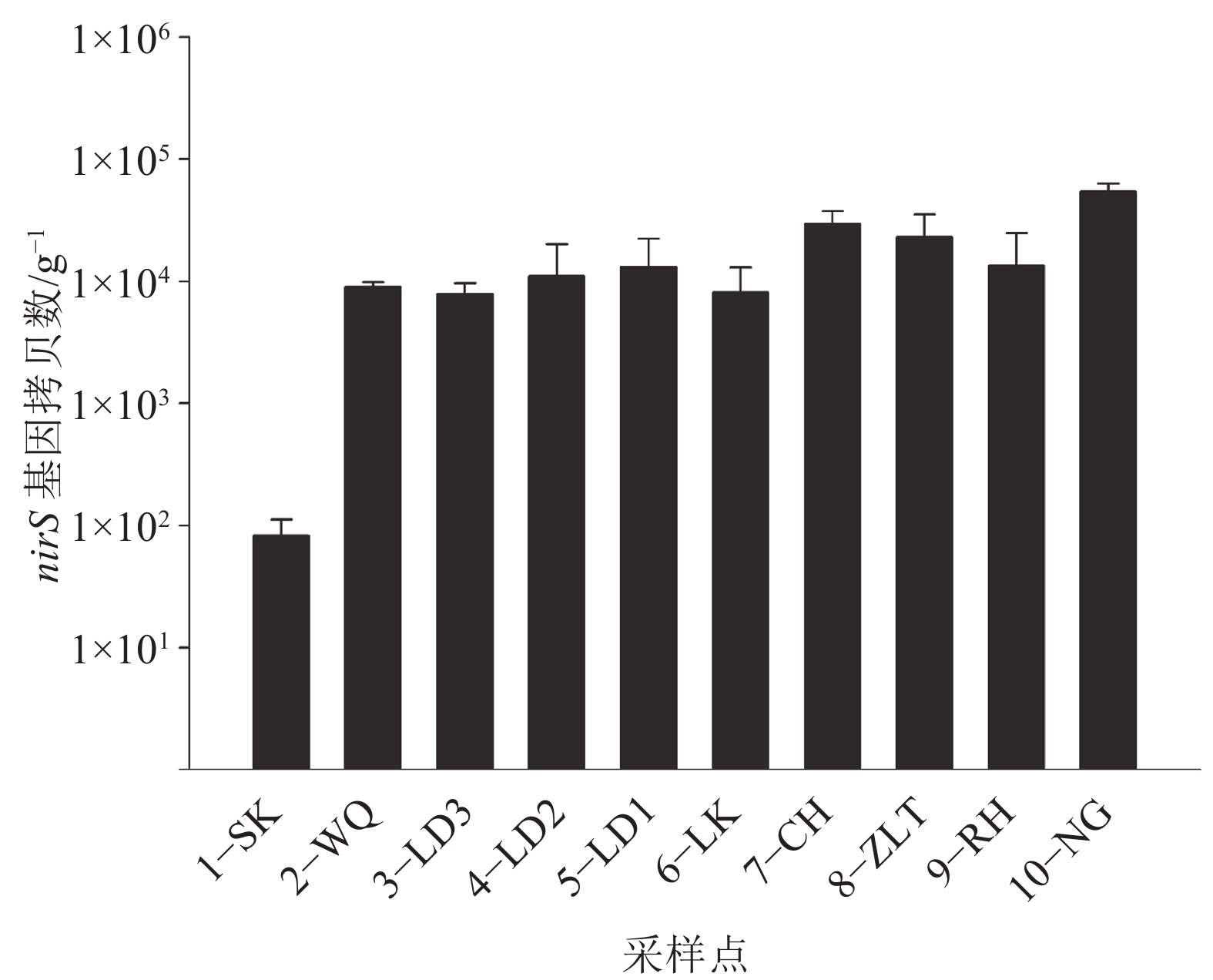 反硝化作用是指反硝化细菌还原硝酸盐,将其逐步转化为气态氮或氮氧化物的过程,主要由硝酸还原酶、亚硝酸还原酶、NO还原酶和N2O还原酶4种酶催化完成[3]。其中亚硝酸还原酶为关键限速酶,主要由nirS和nirK基因编码合成[3-4]。这2个基因经常被用作标志基因来研究环境中的反硝化作用,据报道在河流生态系统中nirS基因比nirK基因分布更广泛,更适合用于沉积物中反硝化作用的研究[5-8]。