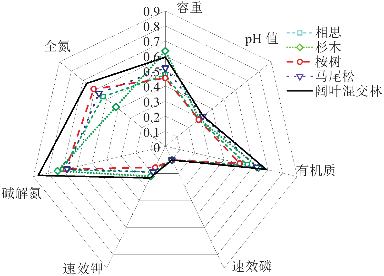 2.2 土壤肥力单项指标评价采用雷达图能直观反映单因素土壤肥力指标在土壤中的状态及土壤肥力的整体状况,不同林分类型各项土壤指标的隶属度函数值如图1所示。5种林分类型各项土壤指标的隶属度值最小的均为速效磷含量,均保持在0.1左右;其次为速效钾,5种林分的隶属度值在0.2左右,表明5种林分类型中土壤肥力的限制性因子是速效磷和速效钾含量。最高的容重隶属度出现在杉木林,最高的pH、有机质、速效钾、碱解氮和全氮含量隶属度均出现在阔叶混交林。