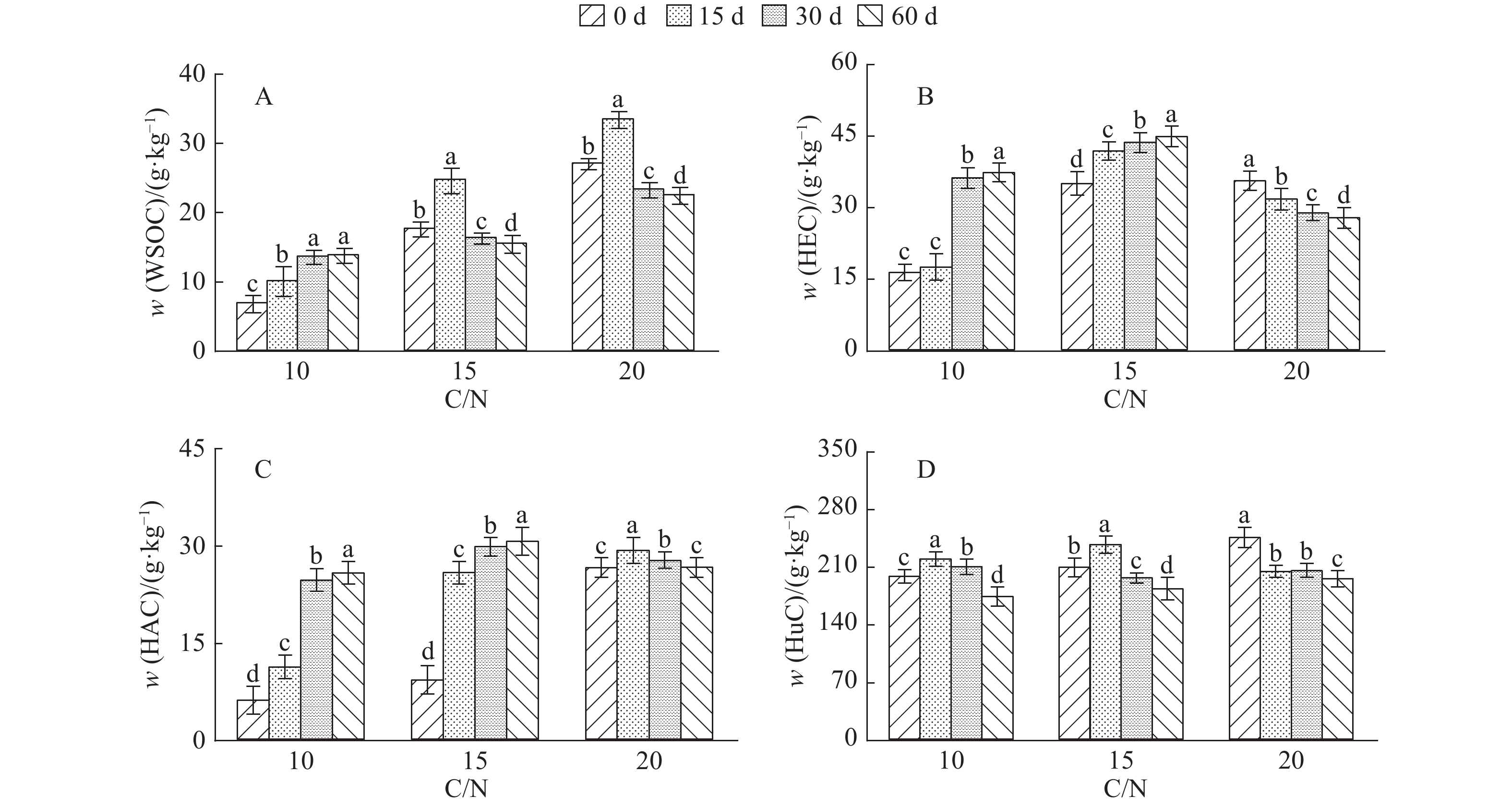2 结果与分析 2.1 C/N对银中杨–玉簪落叶及草坪碎屑混料腐解的影响 2.1.1 C/N对混料腐殖质组成的影响图1显示了C/N对混料腐解过程WSOC、HEC、HAC及HuC含量变化的影响。由图1A可见,C/N为10时,混料WSOC含量随培养进行而渐趋增加,C/N为15或20时,混料WSOC含量随培养进行先增加而后降低,最终有所消耗。由图1B可见,混料C/N为10或15时,HEC含量随培养进行而渐趋增加,培养结束后可分别增加123.4%和55.7%,而C/N为20时所表现的规律相反。由图1C可见,随培养进行,混料C/N为10或15均使混料HAC含量渐趋增加,培养结束后,前者对HAC含量的促进作用更大,使之增加325.3%,而在C/N为20时,混料HAC含量先增加而后逐渐下降,最终稳定在0 d时的含量水平。由图1D可见,在C/N为10或15时,随培养进行,混料HuC含量先增加而后下降,而在C/N为20时,混料HuC含量渐趋降低,培养结束后,C/N为10、15和20时,混料HuC含量的降低程度分别达12.4%、12.4%和20.5%。