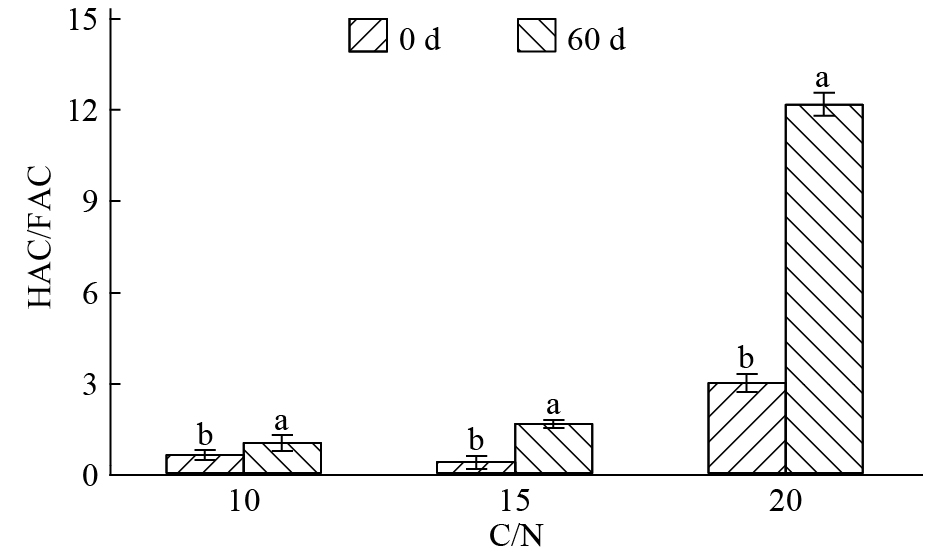 胡富比用于描述有机物料的腐解程度,是衡量腐殖质品质优劣的重要指标,是HAC与FAC含量之间的比值,该比值越大、HAC含量越高,堆腐品质越好[14]。由图2可见,混料C/N对腐解过程HAC/FAC的影响,历经60 d培养,无论混料C/N为10、15或者20,其HAC/FAC均可得到不同程度的提升,增加幅度分别为65.2%、351.0%和309.2%。可见,由银中杨–玉簪落叶及草坪碎屑所组成的混料,无论C/N是10、15或20,历经60 d培养均可使其腐殖质品质得到提升,相比而言,将混料C/N调至15或20时,其对于腐殖质品质的改善效果更加明显,而混料中含有较多氮素,即混料C/N为10时,将在一定程度上抑制FAC向HAC的转化过程。