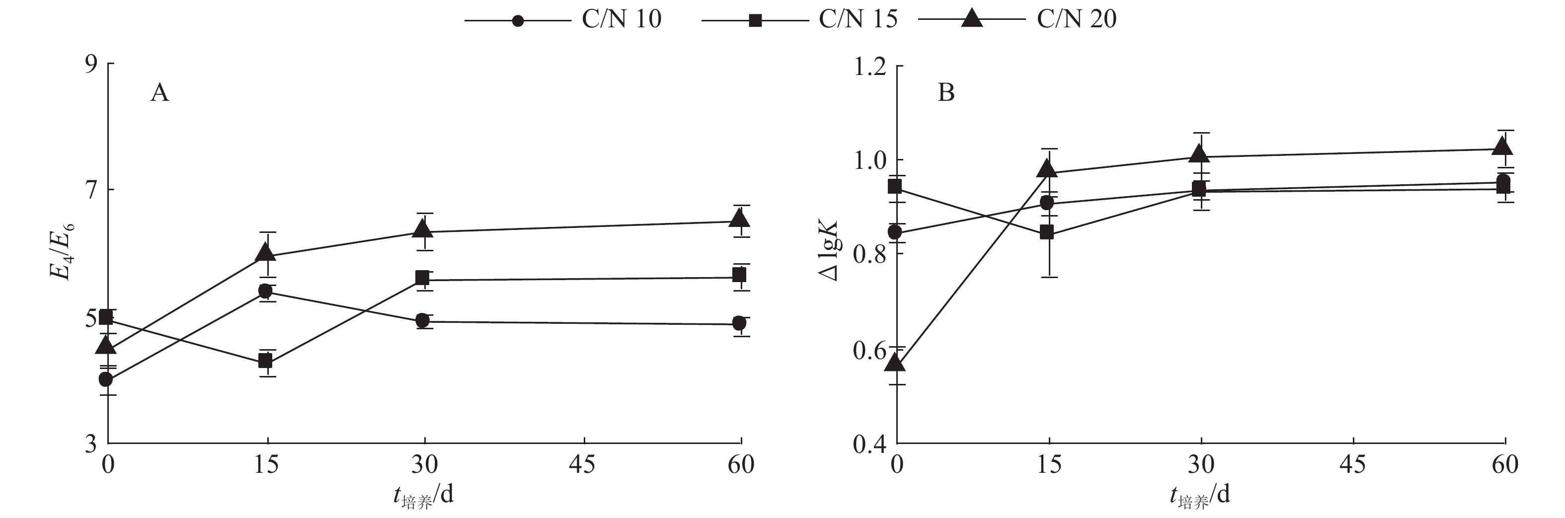 图 3 C/N对混料腐解过程中胡敏酸碱溶液E4/E6及ΔlgK的影响 Figure 3 Effects of C/N ratios on E4/E6 ratios and ΔlgK values of humic acid lye solution extracted from the mixed materials during the decomposition process |