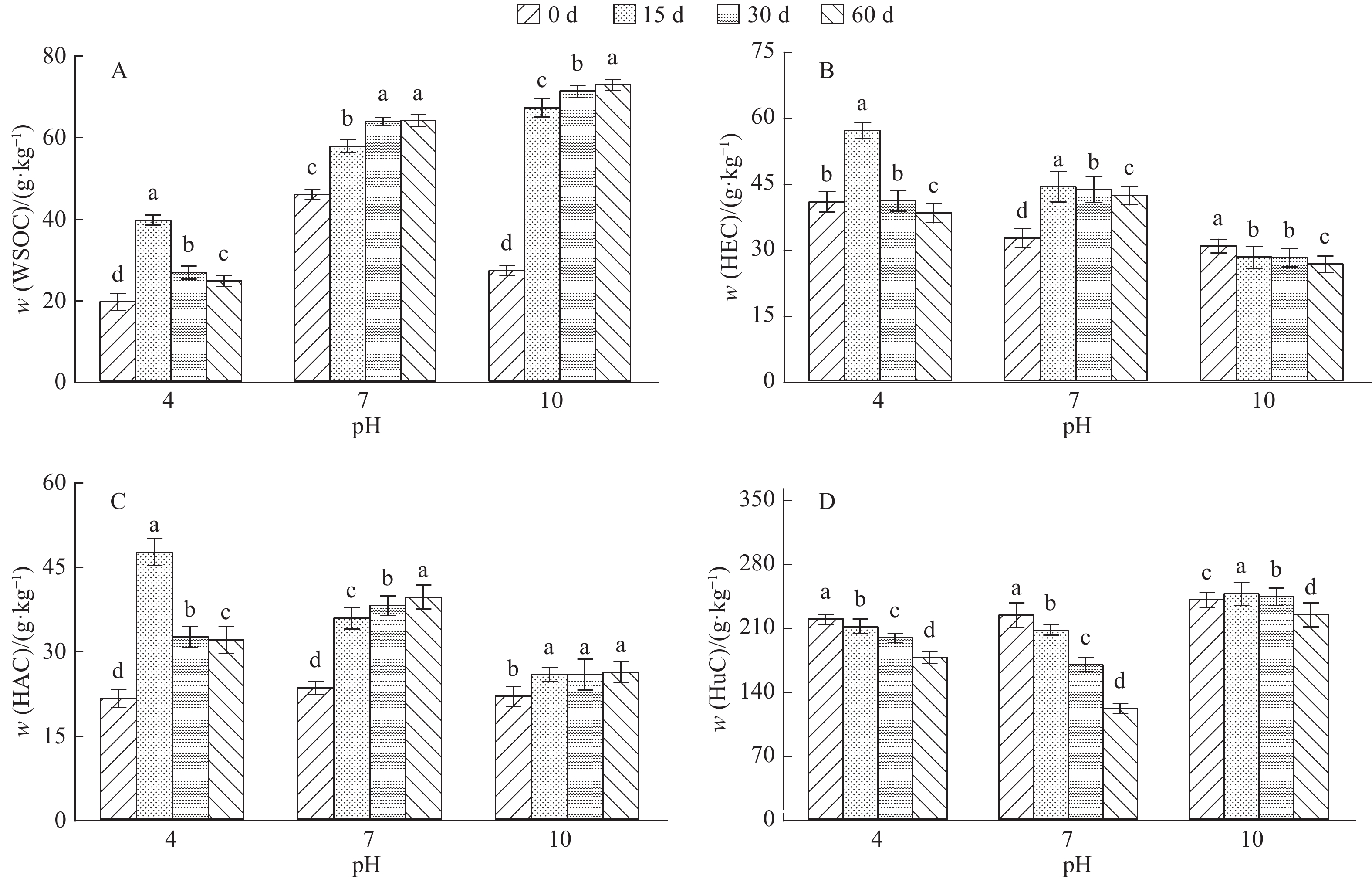3.2 pH对银中杨–玉簪落叶及草坪碎屑混料腐殖质组成的影响pH是影响堆肥腐熟的又一重要指标[4]。在本试验中,无论混料pH为4、7或10,与0 d相比,60 d腐解均可使WSOC含量增加。在碱性条件下,溶解性有机物中类腐殖质组分占有较大比例,酸性条件下,溶解性有机物中类蛋白质及未知组分仍占有较大比例[31]。反之,pH对腐解过程HE、HA和Hu组分的影响则表现出相反规律,pH为7时,混料HA和Hu组分更趋于累积状态,在此过程中,HuC含量大幅下降,这是由于近中性的腐解条件更易于提升微生物活性[32],使微生物对Hu组分的降解能力增强,使降解产物进入HA组分,同时增加了HEC含量;当混料pH为10时,腐解过程HEC有更大的损失程度,但HA组分在此过程有所累积,可间接推断,FAC亦可被微生物大量消耗,有研究指出,FAC与物料pH呈负相关[33-34],最终使HAC/FAC 获得较大程度提升,改善了腐殖质品质。