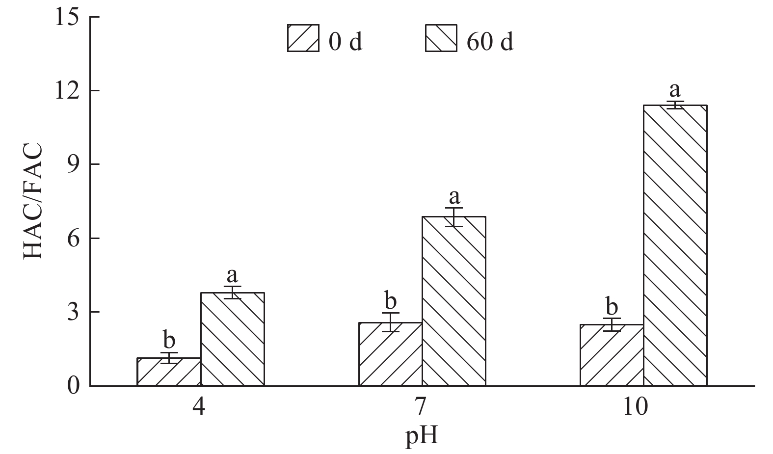 图5显示了混料pH对HAC与FAC间相互转化的影响,经过60 d培养,与0 d相比,混料HAC/FAC均可获得较大程度提升,其pH 4、7和10条件下的增加幅度分别为239.2%、166.9%和361.0%。结合图4B所示HEC含量的变化规律可知,混料pH为4或10皆可对HEC(FAC+HAC)含量表现出较高的消耗程度,而基于HAC/FAC的变化可推断,混料pH为4或10时对于FA组分的利用和转化程度更高,降低了HE组分的含量,同时使HAC/FAC历经较大程度提升。相反,在pH为7的条件下,混料HEC含量有增加趋势,即FAC和HAC的含量之和有所增加,而FA有向HA组分缩合的趋势,使HAC/FAC增加,在此过程中,腐殖酸活性减弱,品质有所提升。