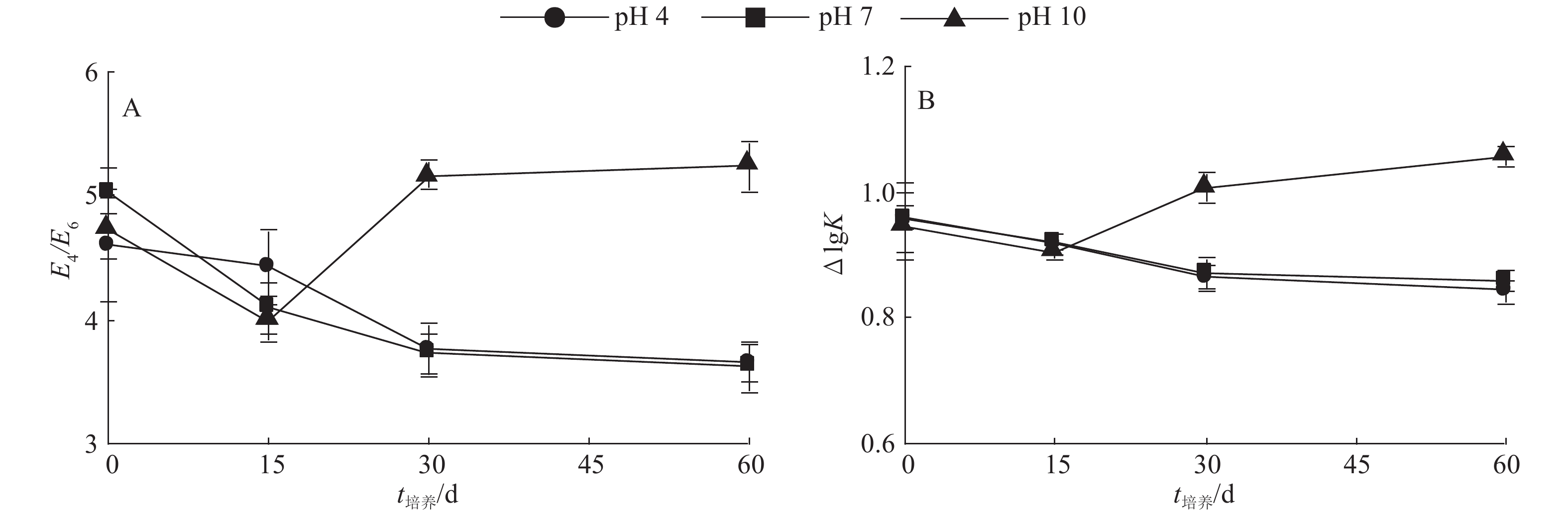 由图6可见,在pH影响下,混料HA碱溶液E4/E6和ΔlgK均随培养进行而表现为相似的规律。当混料pH为4或7时,HA碱溶液的E4/E6和ΔlgK均随培养进行而渐趋降低,而在pH为10的条件下,E4/E6和ΔlgK先下降而后大幅度提升,培养结束后,E4/E6和ΔlgK均有所提升。由此可知,混料pH为4或7时,随培养进行,HA分子结构渐趋复杂,而当混料pH为10时,HA分子结构先趋于复杂,而后又简单化。