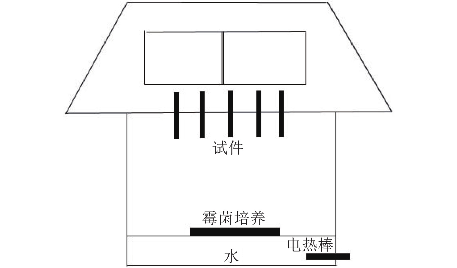 1.2.2 霉变箱模拟墙板在适宜环境温湿度条件下的霉变情况,参考GB/T 18261—2013[21]规定的户外试验方法并进行改良,制成专用的霉变测试箱。霉变测试箱体部分如图1所示,由整理箱和密封观察窗构成。测试箱底部用带温控的加热棒加热水,形成水蒸气;在水的上部有托盘,不与水接触,但装有土壤,上面喷洒各种霉菌孢子悬浮液;中上部有横杆,用于悬挂霉变测试木材样品,不与水和土壤相接触;最上部为对坡型的顶盖,一面开口进行观察;整个装置保持密闭,放置在环境温度为25~28 ℃的房间内。