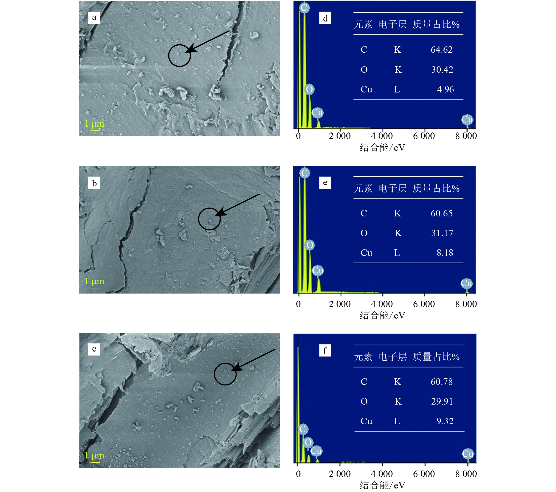 图 2 含铜马尾松热处理材的扫描电镜(SEM)与能谱(EDS)分析 Figure 2 Scanning electron microscope (SEM) and energy disperse spectroscopy (EDS) analyses of copper-contained Pinus massoniana heat-treated wood a为CuG2203的SEM,b为CuG2205的SEM,c为CuG2207的SEM,图中箭头所指为附着在木材上的铜颗粒;d为CuG2203的EDS,e为CuG2205的EDS,f为CuG2207的EDS |