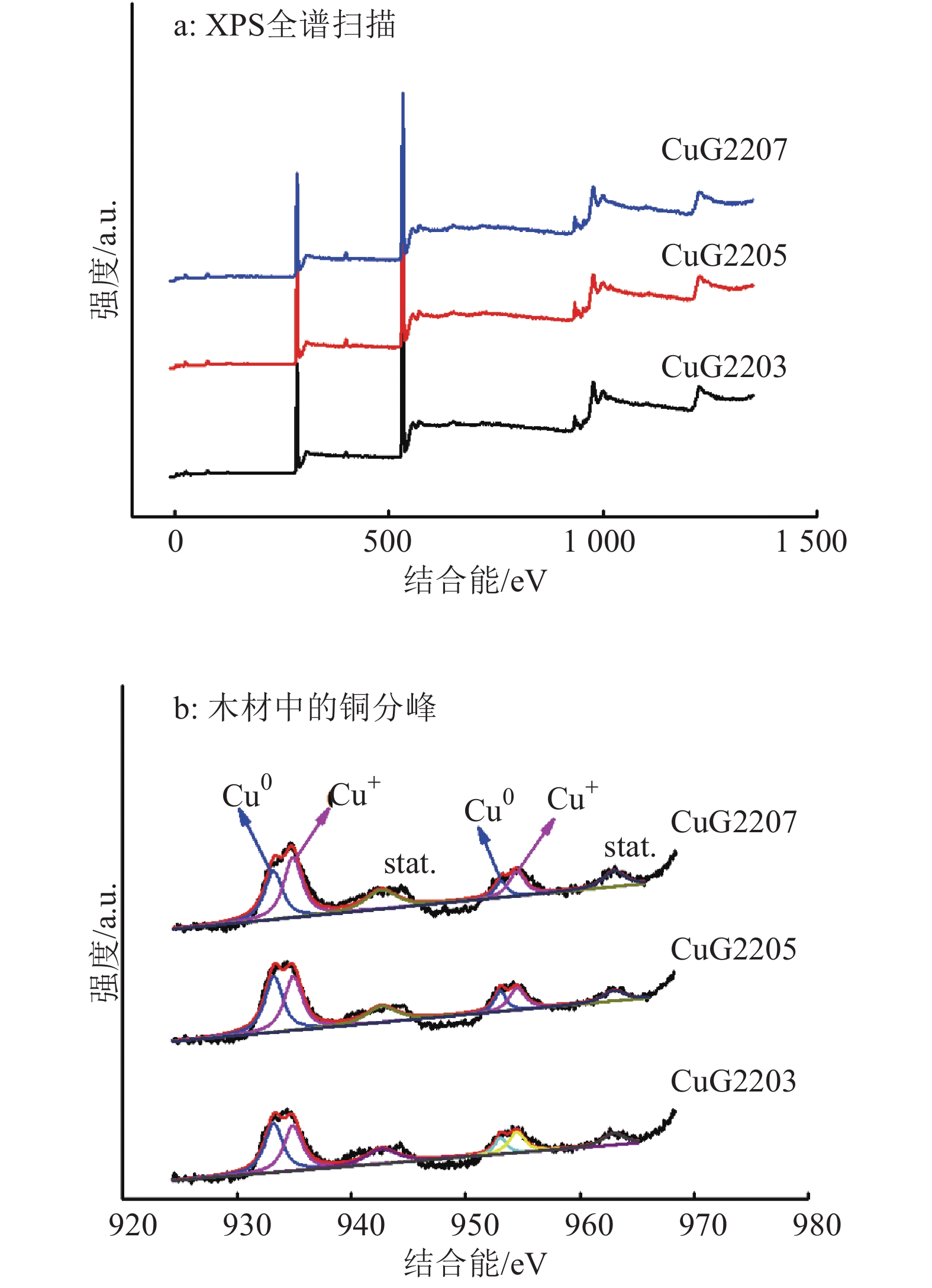 图 3 含铜马尾松热处理材的X射线光电子能谱(XPS) Figure 3 X-ray photoelectron spectroscopy test of copper-contained Pinus massoniana heat-treated wood |