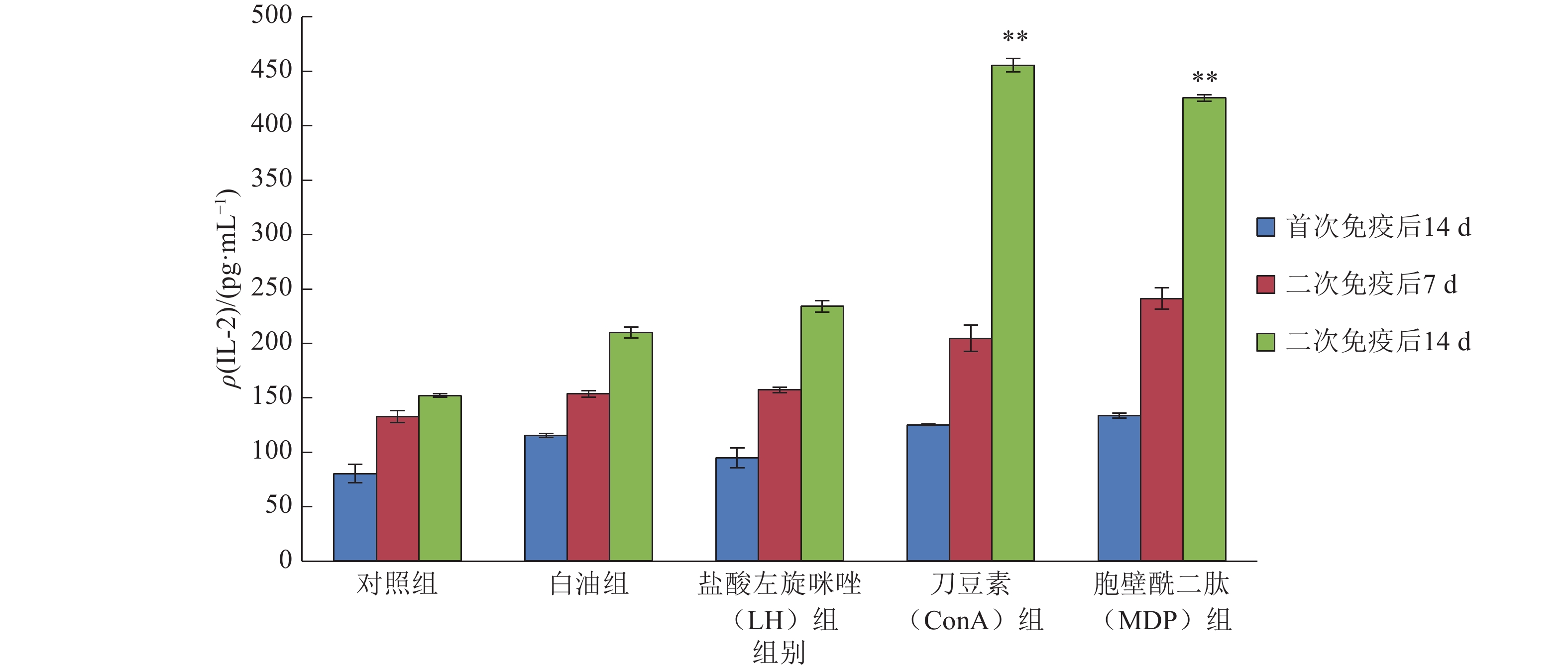 图 1 小鼠血清中IL-2含量 Figure 1 The content of IL-2 in mouse serum 相同颜色柱子上“**”表示与白油组相比,差异达到0.01的显著水平(t检验) |