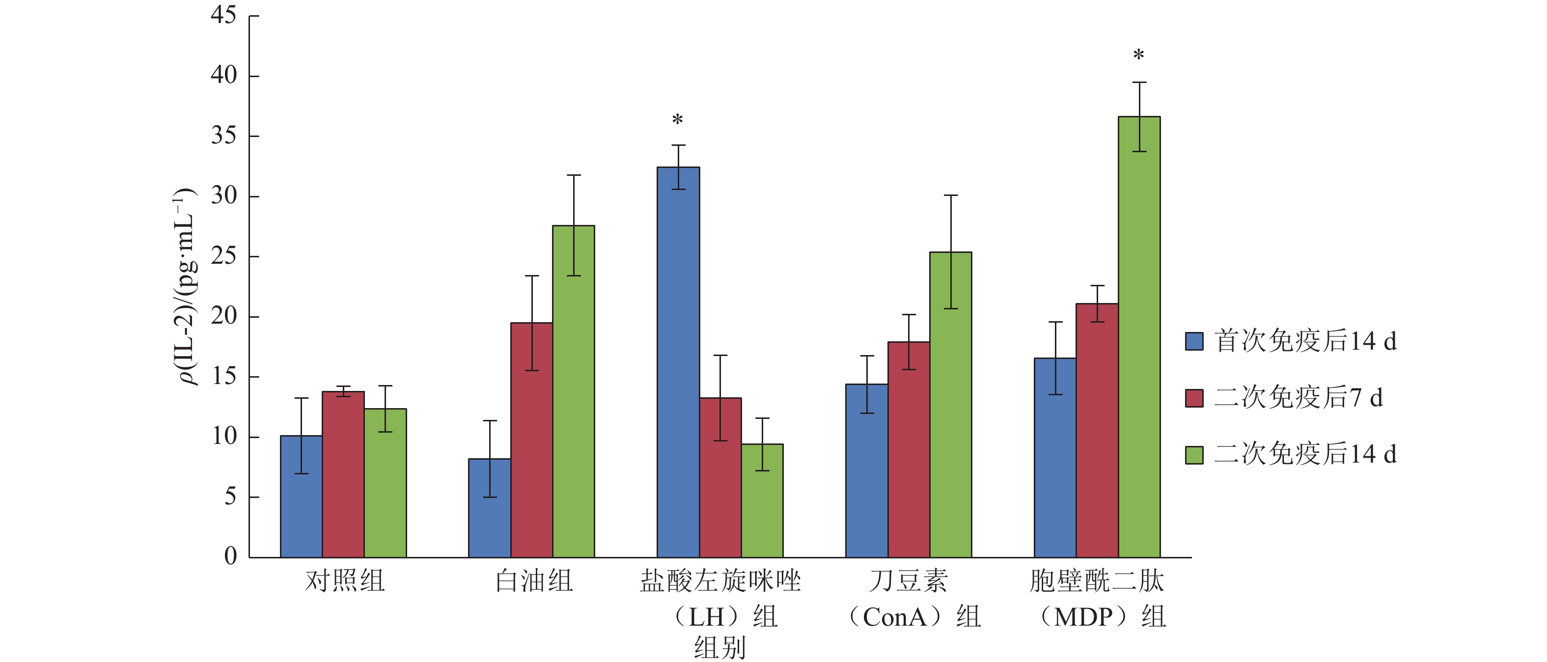 从图2可看出,白油组和免疫增强剂组对小鼠血清中IL-4含量均有提升效果。LH组在首次免疫后14 d提升效果最佳, 相比其他组差异显著(P<0.05),IL-4含量为32.43 pg·mL–1,二次免疫后14 d恢复到正常水平。白油组、ConA组和MDP组的提升效果在二次免疫后14 d较好,且MDP组效果最优,相对于白油组有显著提升(P<0.05),IL-4含量为36.63 pg·mL–1。