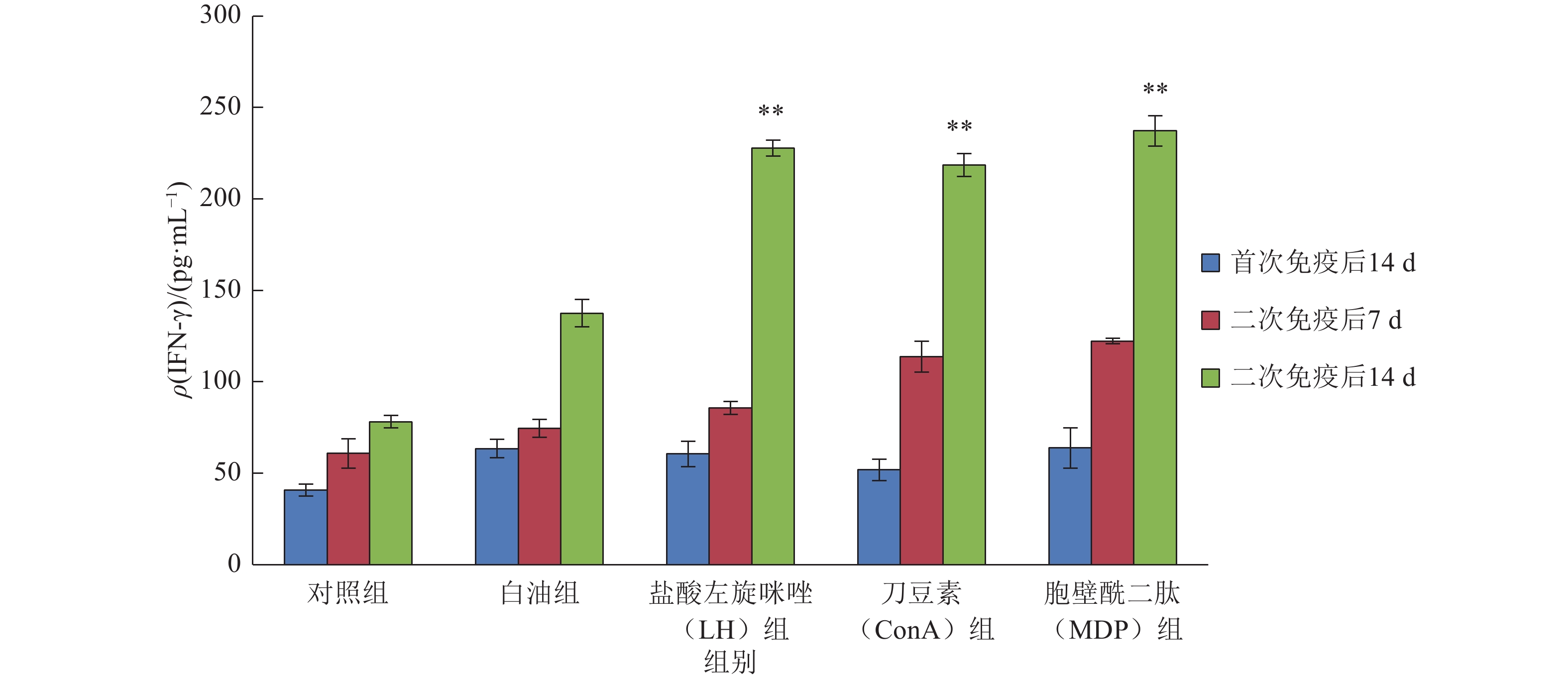 图 3 小鼠血清中IFN-γ含量 Figure 3 The content of IFN-γ in mouse serum 相同颜色柱子上“**”表示与白油组相比,差异达到0.01的显著水平(t检验) |