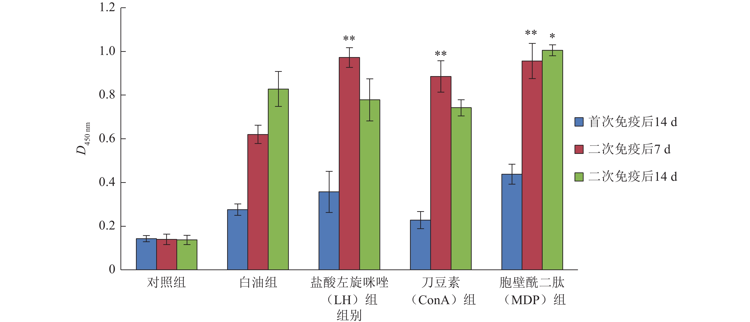 从图4可看出,相对于对照组,白油组和免疫增强剂组抗体水平均有明显提高,且免疫增强剂组效果较优。二次免疫后7 d,免疫增强剂组抗体水平较白油组提升极显著(P<0.01),LH和MDP组效果优于ConA组,此时各组D450 nm值分别为LH组0.972、ConA组0.885、MDP组0.956。二次免疫后14 d,白油组和MDP组抗体含量达较高水平,LH组和ConA组抗体水平较二次免疫后7 d有所下降且低于白油组,此时所有组别中,MDP组对抗体含量提升效果最好,D450 nm值为1.005,较白油组提升效果显著(P<0.05)。