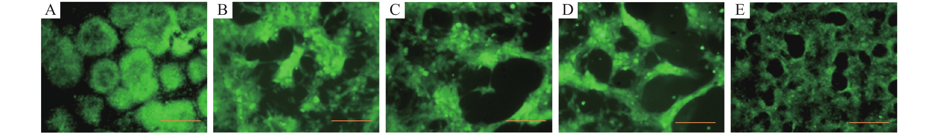 图 2 不同感染温度下CyHV-3体外增殖的荧光显微镜观察结果 Figure 2 Observation of CyHV-3 proliferation in vitro under different temperature using fluorescence microscope A:4 ℃,B:15 ℃,C:25 ℃,D:30 ℃,E:37 ℃;标尺=200 μm |