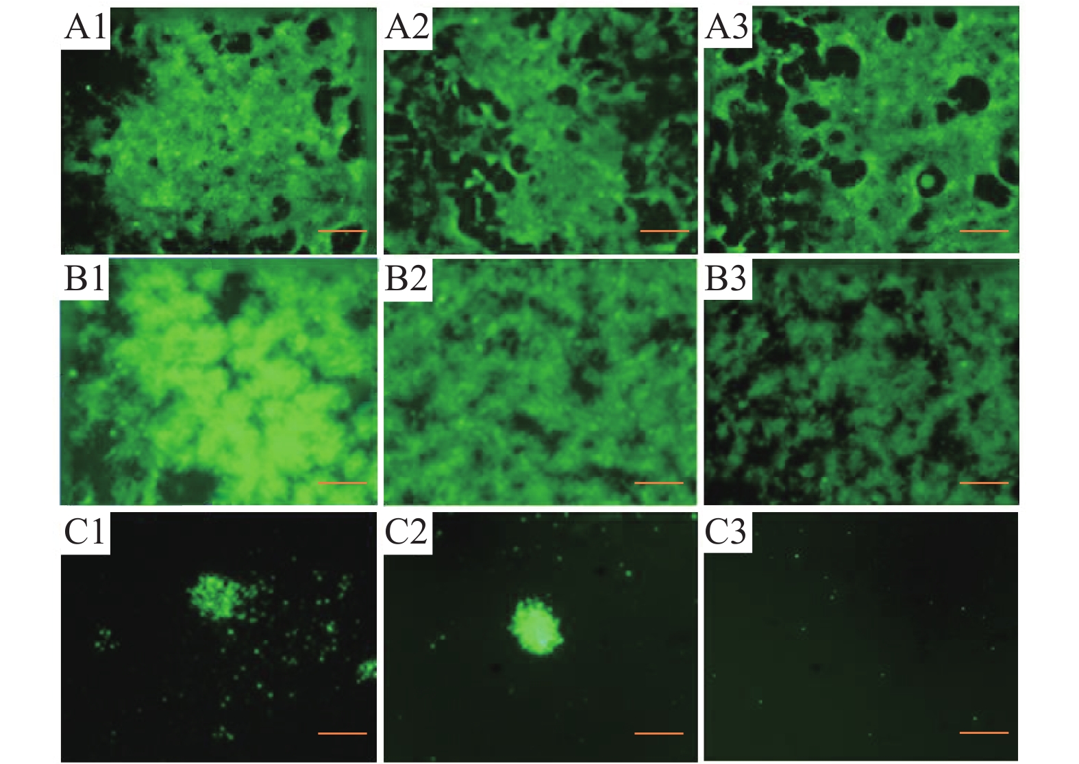 图 3 不同感染和孵育温度下CyHV-3体外培养的荧光显微镜观察结果 Figure 3 Observation of CyHV-3 culture in vitro under different infection and incubation temperatures using fluorescence microscope A1、A2和A3的感染温度分别为15、25和30 ℃,孵育温度为15 ℃;B1、B2和B3的感染温度分别为15、25和30 ℃,孵育温度为25 ℃;C1、C2和C3的感染温度分别为15、25和30 ℃,孵育温度为30 ℃;标尺=200 μm |