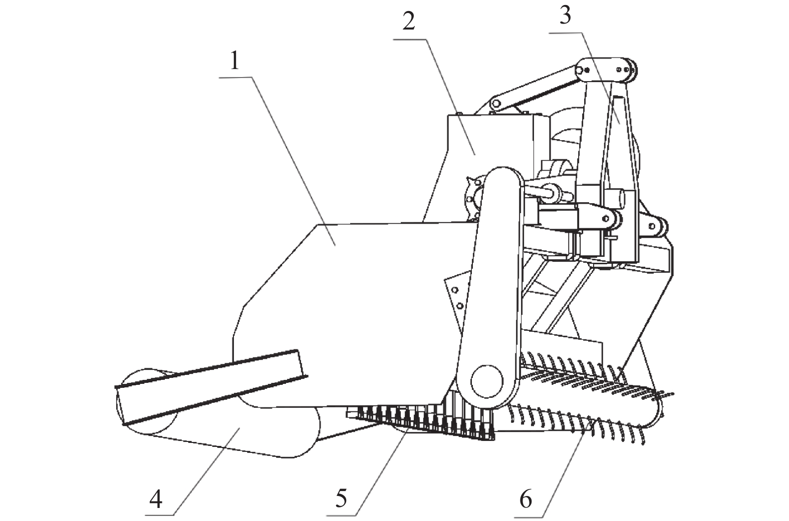 图 1 灭茬机结构简图 Figure 1 Structure diagram of stubble cleaner 1:机壳,2:传动机构,3:悬挂机构,4:镇压机构,5:粉碎机构,6:扶茬机构 |