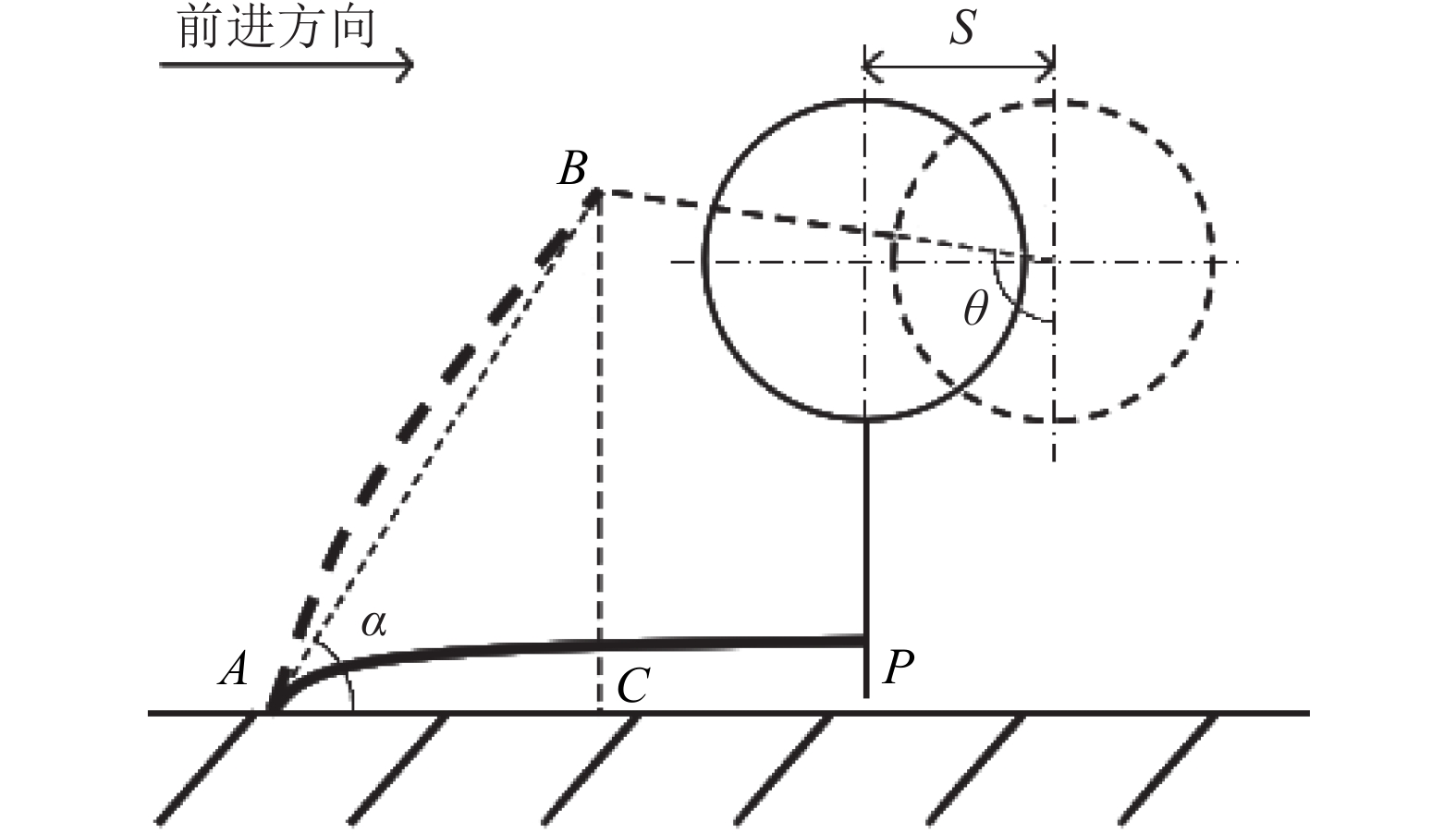 1.2 扶茬机构及传动设计 1.2.1 扶茬机构关键参数图2为扶茬机构工作原理简图。扶指运动至P点后切入秸秆顶部与地面的间隙,并随机具前进与扶辊回转扶起秸秆,最后再次于B点脱离秸秆。经预试验中测得,灭茬机旋转所产生的风力场可有效将倒伏角大于25°的秸秆送至喂入口,因而扶辊只需将倒茬扶起至一定角度后即可脱离秸秆,从而达到降低功耗、减小辊轮损耗的目的。