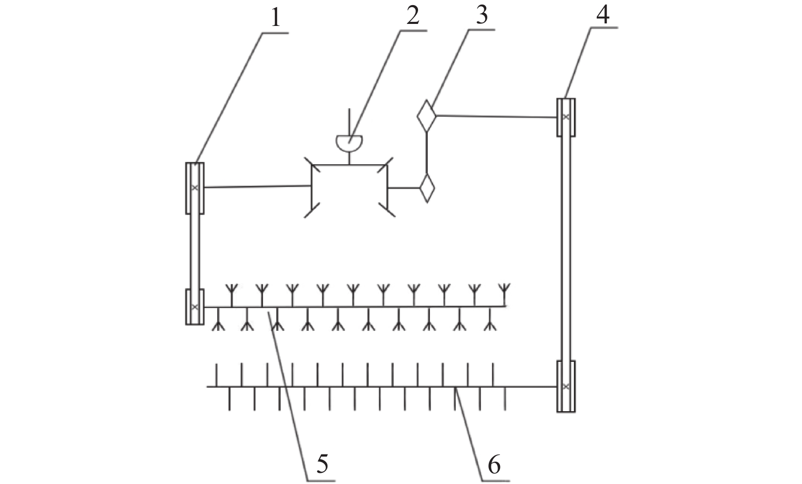 图 4 传动系统示意图 Figure 4 Schematic diagram of transmission system 1:左侧皮带轮,2:万向节,3:过桥链轮,4:右侧皮带轮,5:粉碎刀辊,6:扶辊;中央为变速箱一级传动,左侧边为灭茬刀辊传动系统,右侧边为扶辊传动系统 |