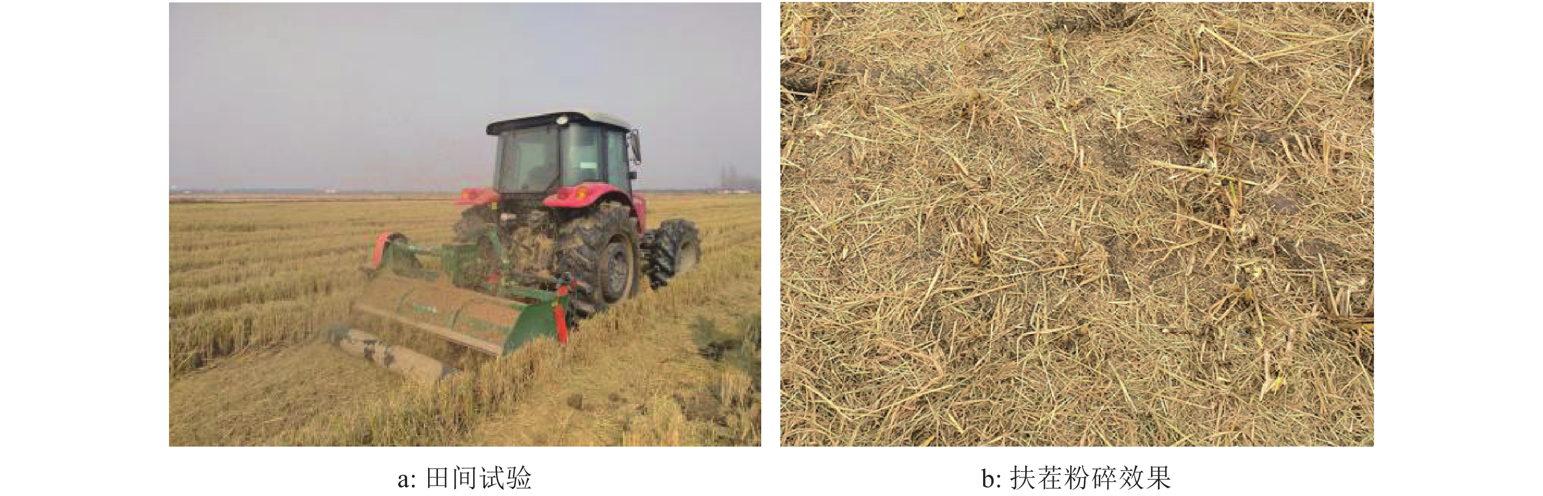 试验于2017年11月5日在江苏省泗洪县现代农业科技示范基地进行,田间试验状况如图5所示。试验地地势平坦,秸秆产量1.13 kg·m–1,谷草比约为0.76,秸秆含水率(w)26.32%,秸秆平均长度317 mm。经由久保田–688全喂入履带收割机完成收割作业,配套动力为福格森–1204拖拉机,作业幅宽为2 000 mm,履带宽400 mm,田间倒茬面积占比为40%。试验中由拖拉机前后轮再次压倒秸秆后倒茬占比约为56.5%,其中,收割机轮辙处18.5%、双机具轮辙处21.5%和灭茬机轮辙处16.5%。