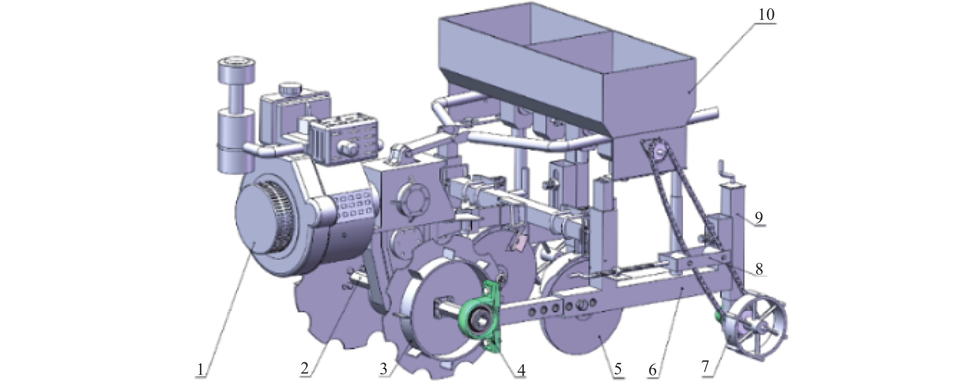 图 1 微耕机驱动的圆盘刀式玉米免耕播种机结构示意图 Figure 1 Structural sketch of disc-cutting type maize no-till seeder driven by micro tillage machine 1:微耕机;2:刀轴;3:圆盘刀破茬限深轮行走装置;4:轴承座;5:双圆盘播种施肥装置;6:机架;7:地轮;8:链条张紧装置;9:升降地轮支架;10:种肥箱 |