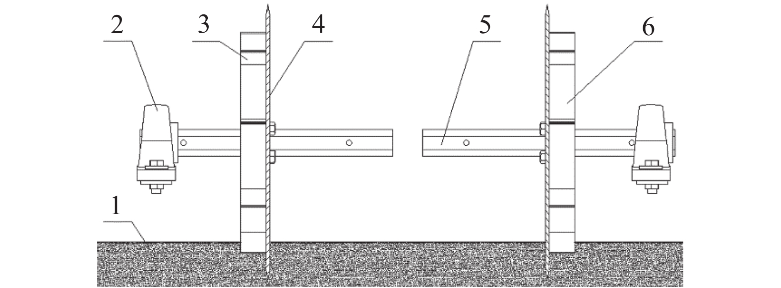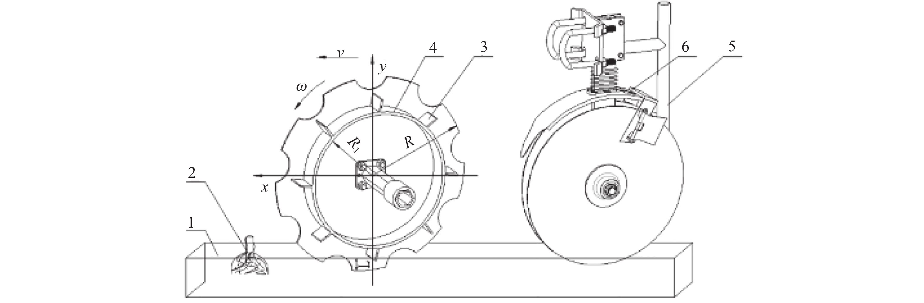 图 3 破茬防堵限深轮装置结构原理示意图 Figure 3 Schematic diagram of depth wheel with stubble breaking and anti blocking function 1:土壤;2:玉米根茬;3:圆盘刀;4:限深轮行走装置;5:排肥管;6:排种口 |