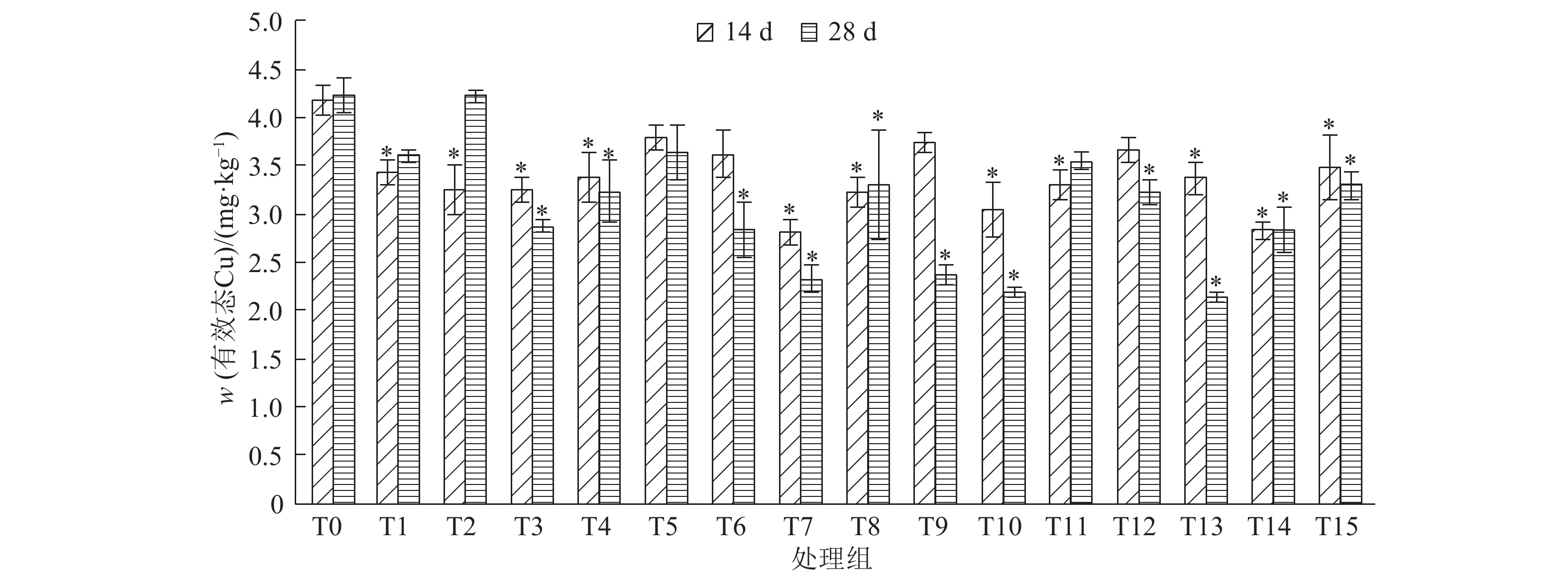 图 1 培养14和28 d后各处理组土壤的有效态Cu含量 Figure 1 The contents of available Cu in all treatment groups after culturing for 14 and 28 days 相同柱子上*表示与对照组(T0)差异显著(P < 0.05,One-way ANOVA方差分析) |