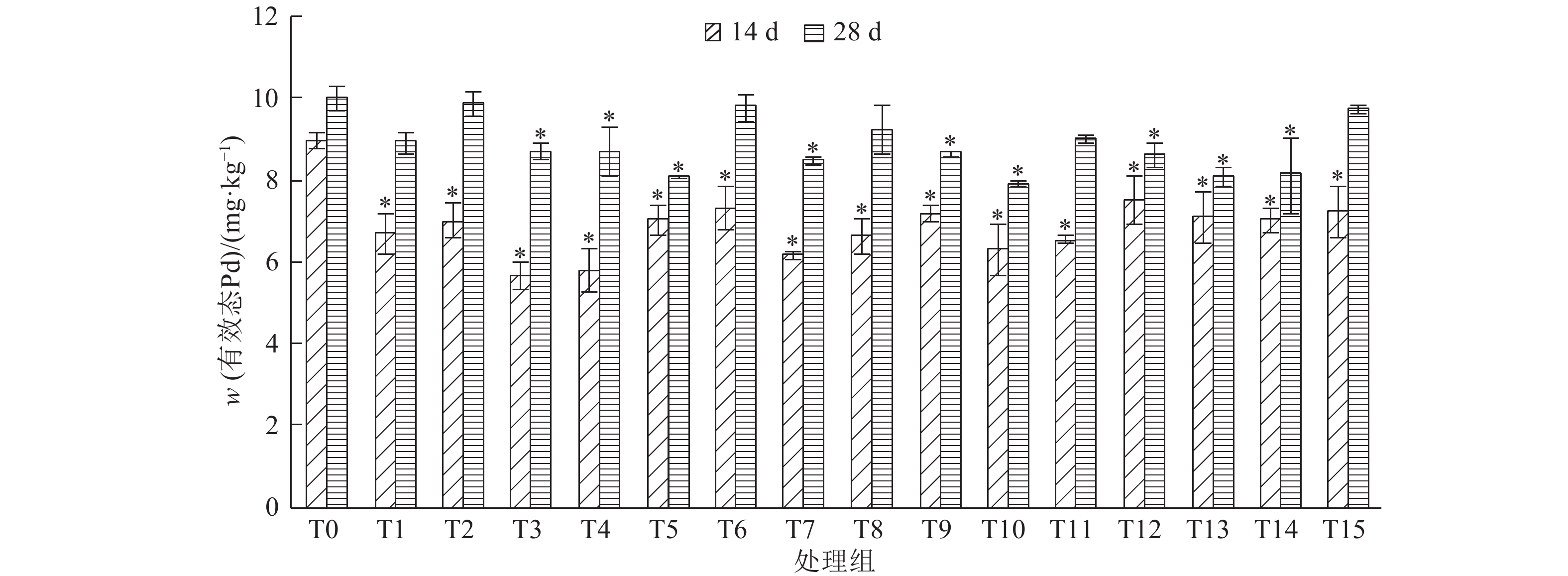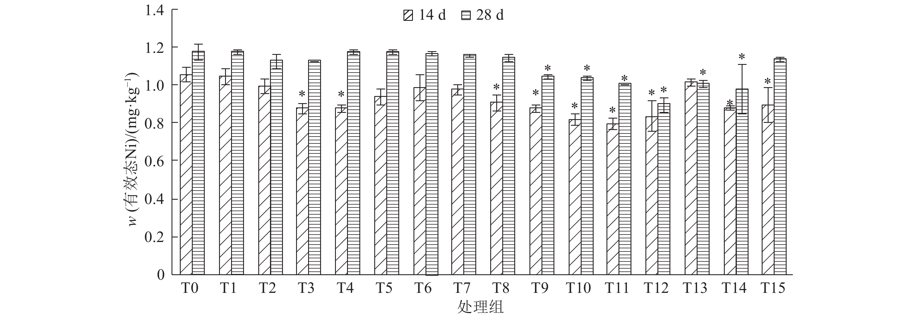 与培养14 d相比,培养28 d后各处理组土壤的有效态Ni含量都升高,其中T1、T3、T4、T5、T7、T8、T9、T10和T11处理组差异达到显著水平。