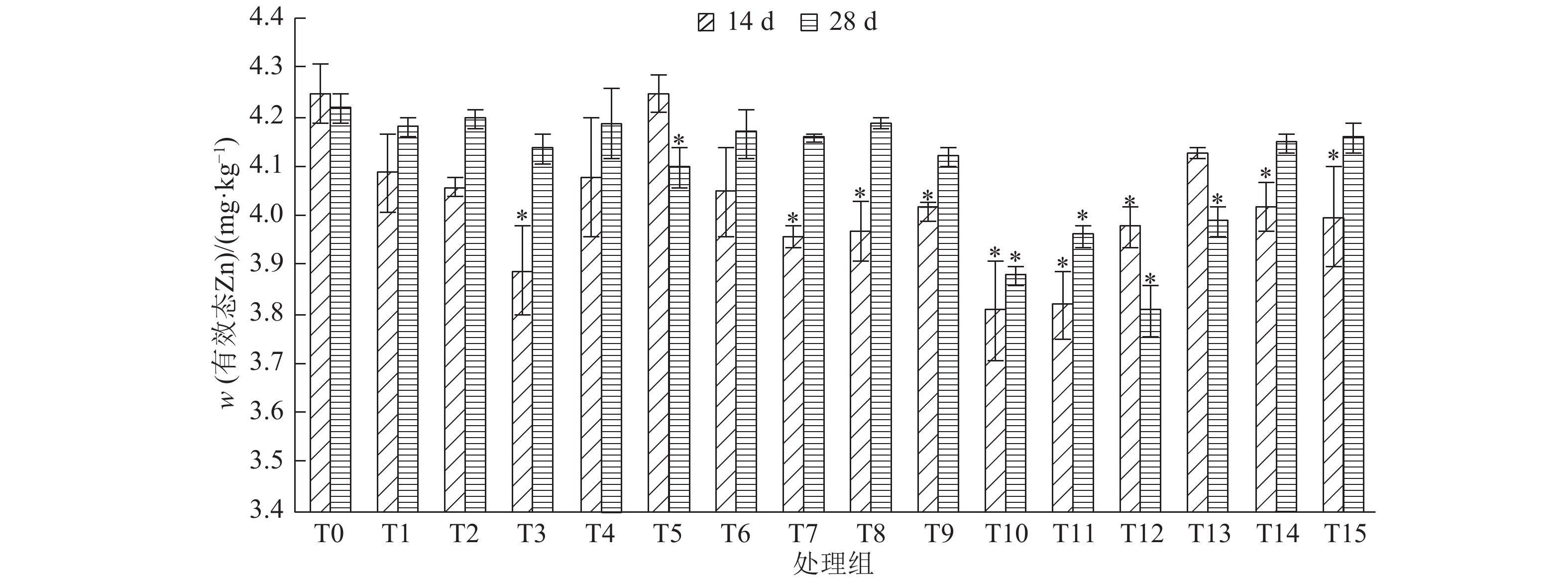 图 4 培养14和28 d后各处理组土壤中有效态Zn含量 Figure 4 The contents of available Zn in all treatment groups after culturing for 14 and 28 days 相同柱子上*表示与对照组(T0)差异显著(P < 0.05,One-way ANOVA方差分析) |