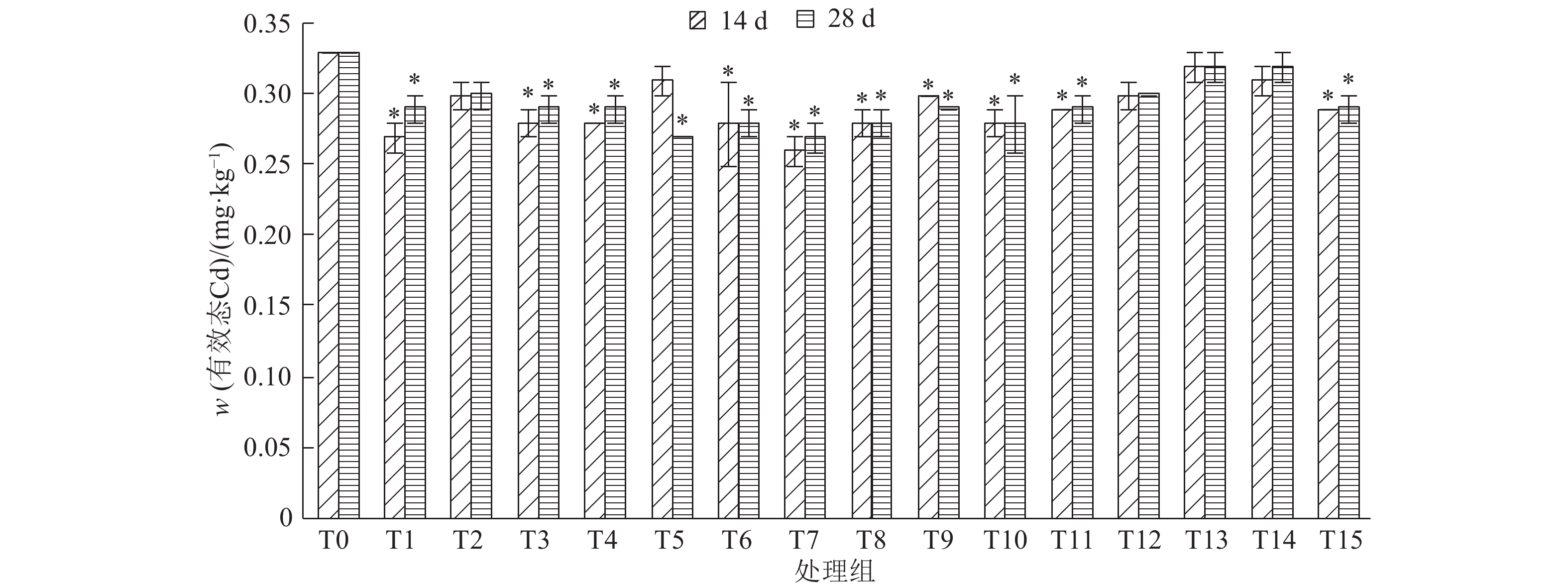 图 5 培养14和28 d后各处理组土壤中有效态Cd含量 Figure 5 The contents of available Cd in all treatment groups after culturing for 14 and 28 days 相同柱子上*表示与对照组(T0)差异显著(P < 0.05,One-way ANOVA方差分析) |